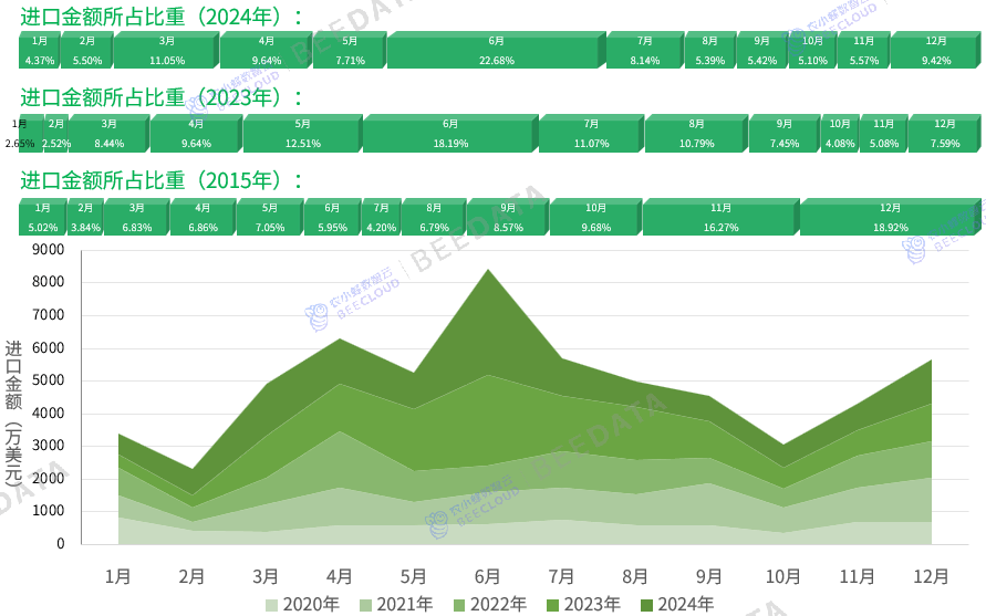 2024年,中国牛油果进口次要集中正在二季度,上半年进口的牛油果进口规模较着高于下半年,此中,正在6月份集中的态势最为较着。